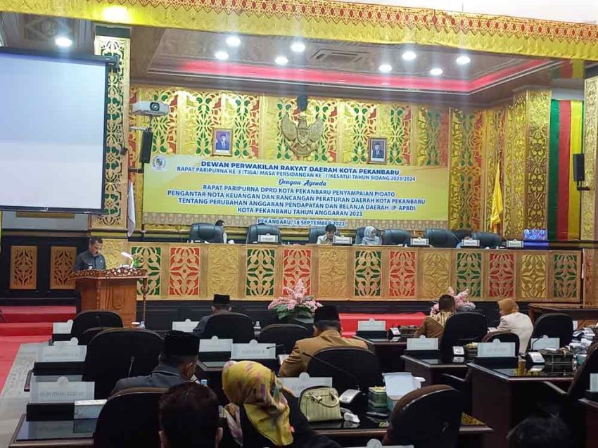pikiranriau.com, Pekanbaru - DPRD Pekanbaru menggelar Rapat Paripurna Penyampaian Pidato Pengantar Nota Keuangan dan Rancangan Peraturan Daerah (Ranperda) tentang APBD Perubahan Tahun Anggaran 2023, Senin (18/9/2023).